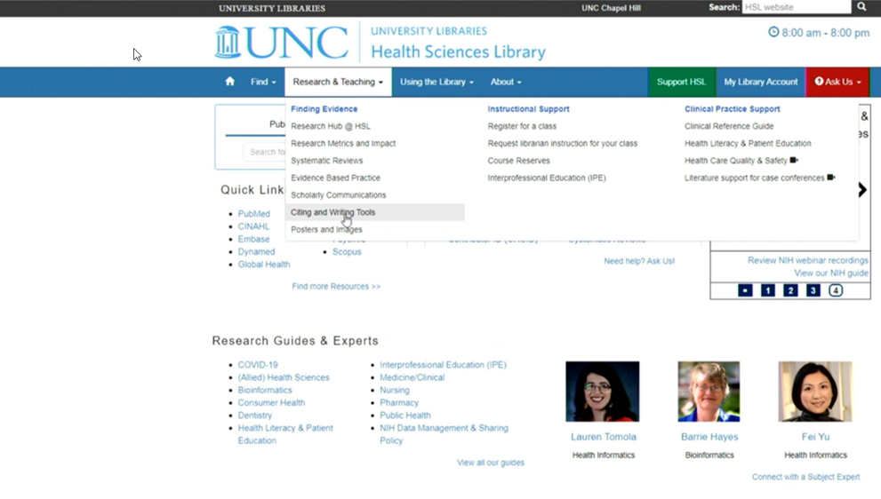 UNC Highway Safety Research Center have added guidance on their webpage about Citing and Writing tools. Users can register for instructional support classes, for example, an introduction to Zotero or advanced uses of Sciwheel. Users can either attend in-person workshops for the induction training or watch it virtually via Zoom. The role of the librarian is to educate themselves on what their users need and advise users on which reference management tool is best suited for their projects.